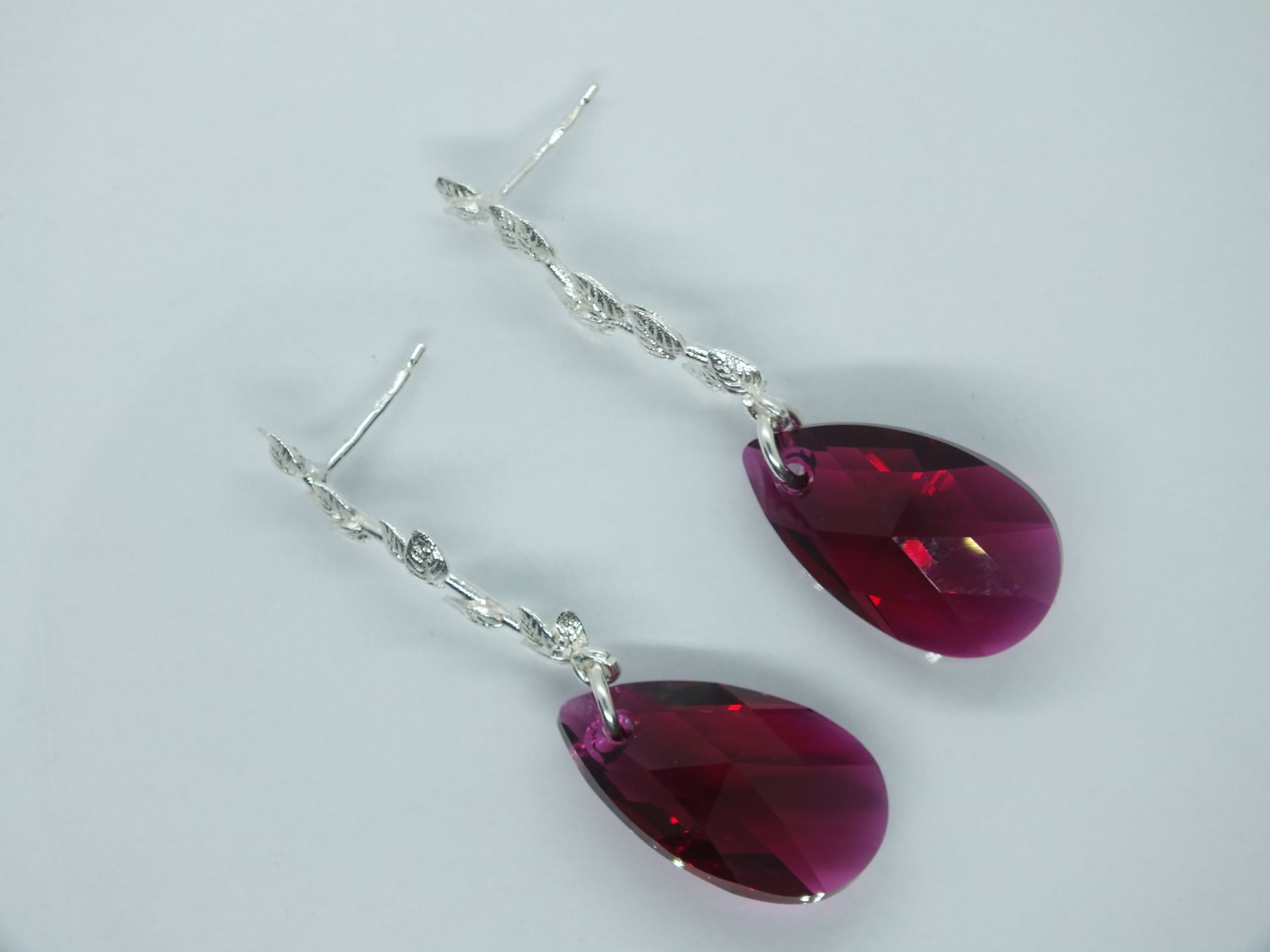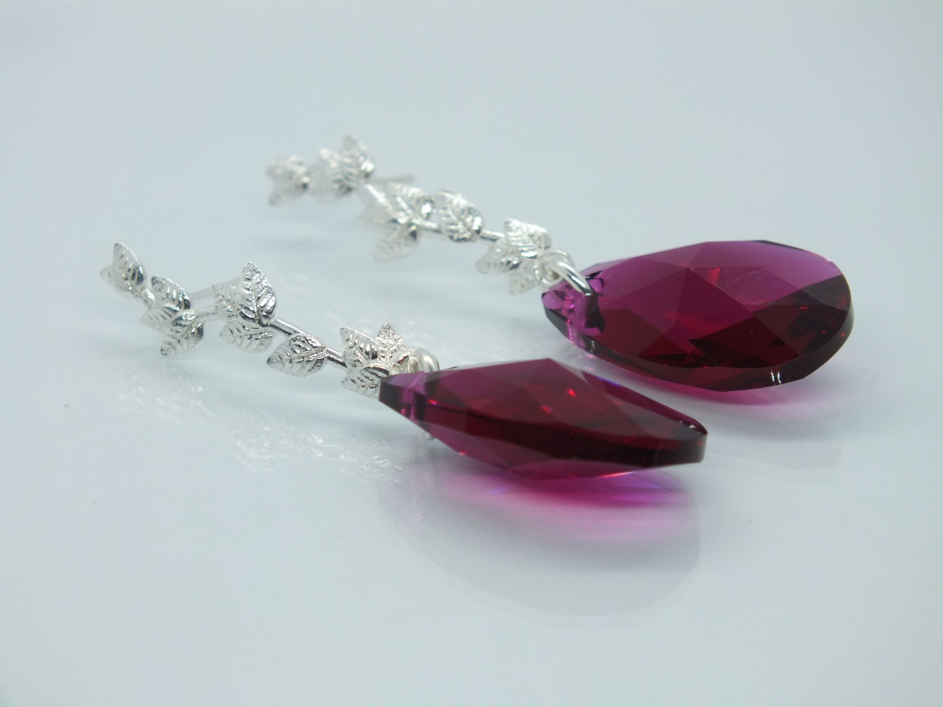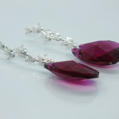 Női ezüst fülbevaló,levél ágon logó könnycsepp formájú csiszolt lilás színű cirkónia kő.