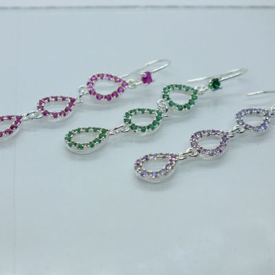 Női ezüst fülbevaló, három összekapcsolt függő könnycsepp körvonalak melyek rózsaszín, zöld színű cirkónia kövekkel díszített. Színválasztást a megjegyzés rovatnál kell feltüntetni.