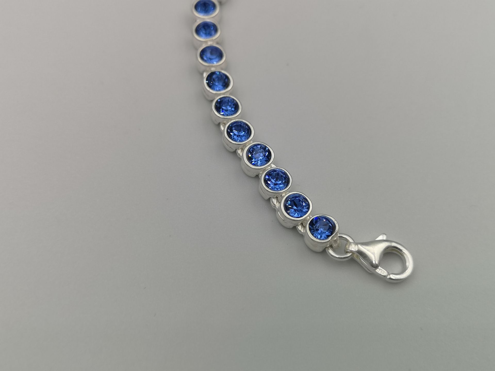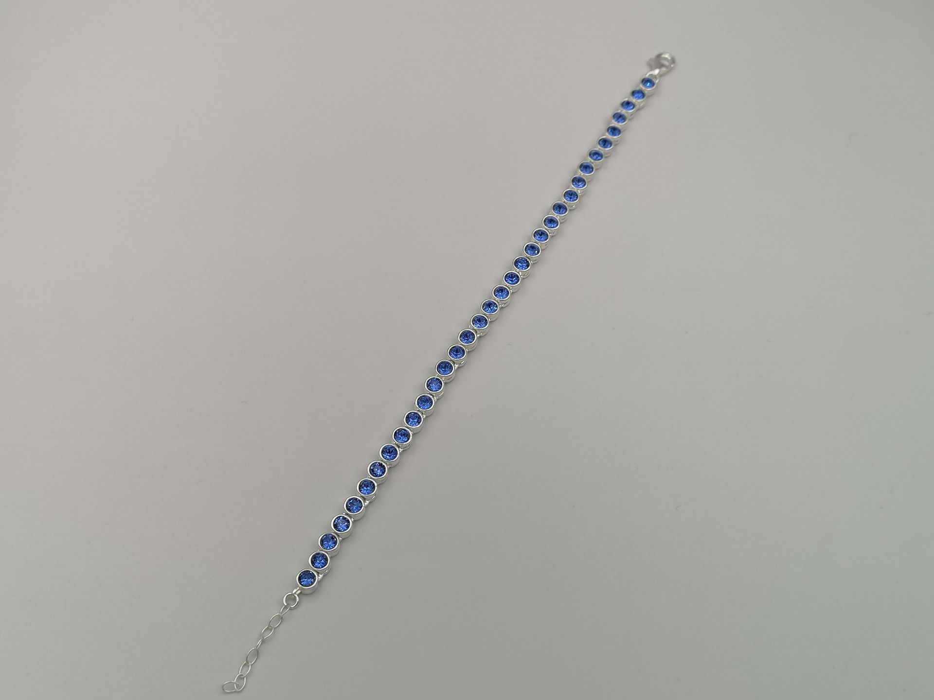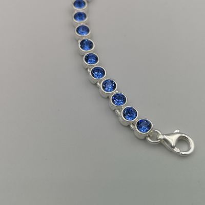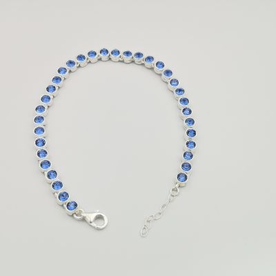 Elegáns ezüst női karkötő,kék színű cirkóniákkal díszítve.