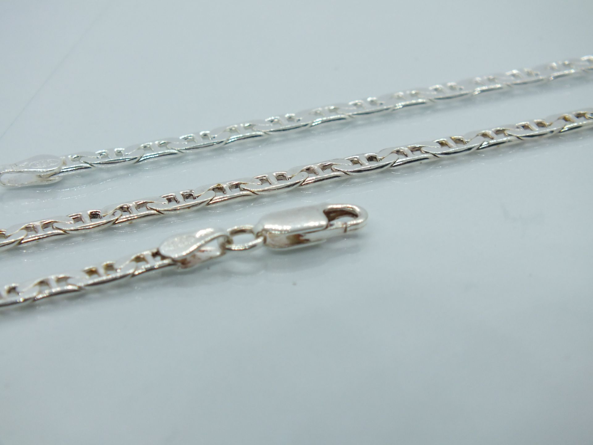 Ezüst karkötő lapos csiszolt ovális láncszemek.Pálcás pancer stílus. Karkötő hossza.20cm Szélessége:3,7mm Vastagsága:0,9mm