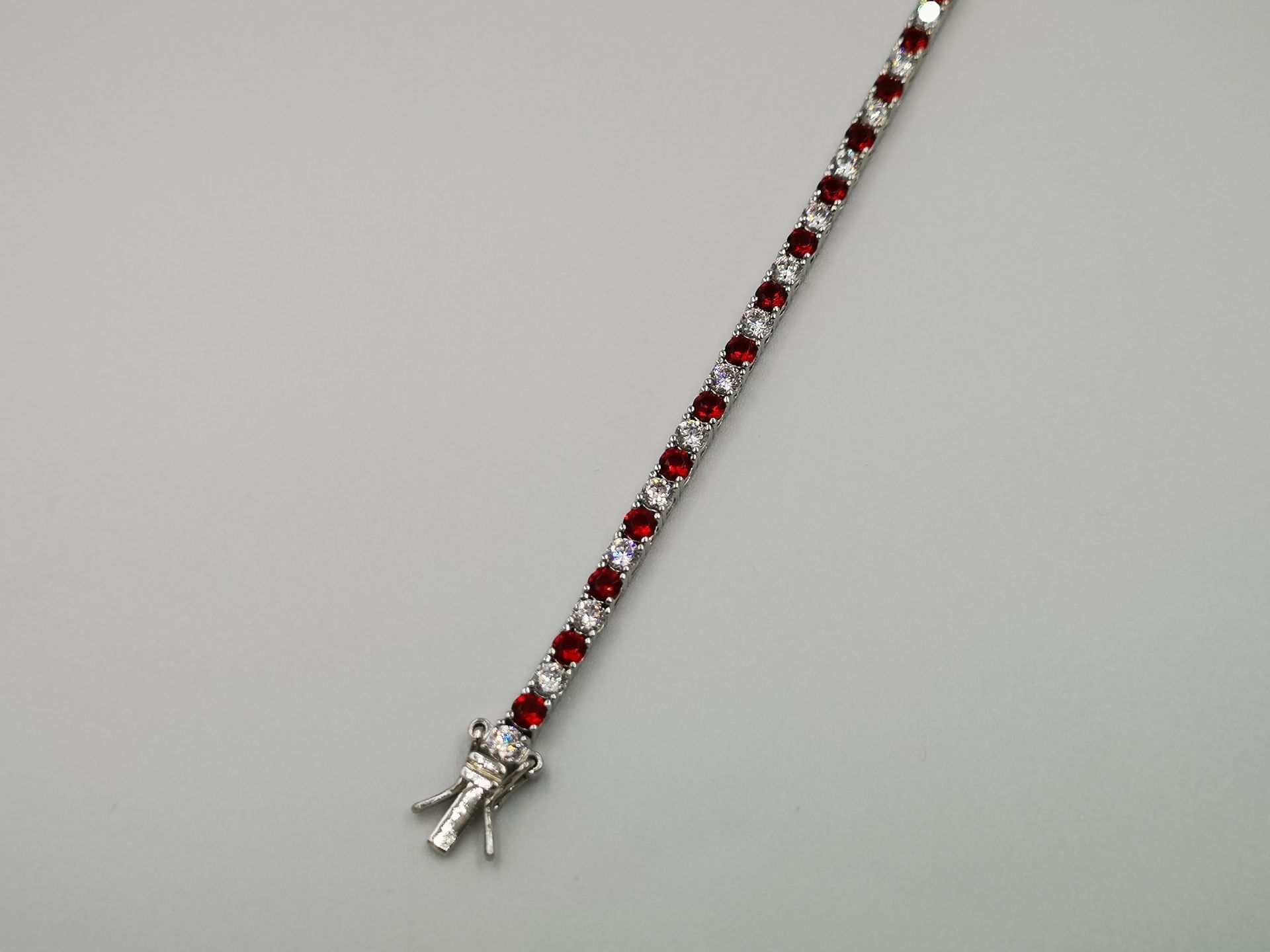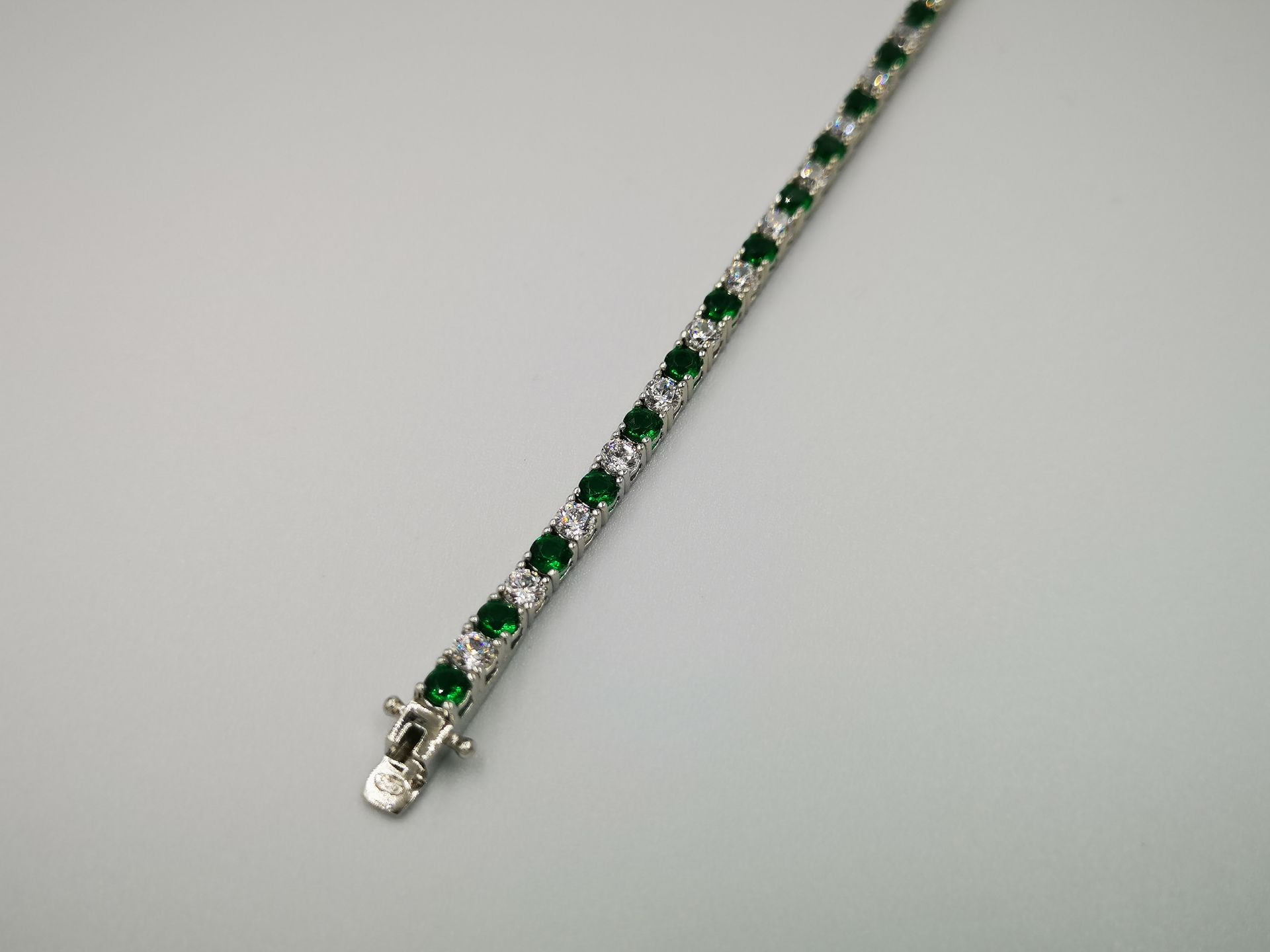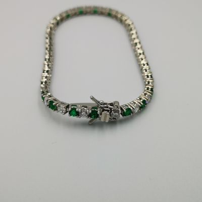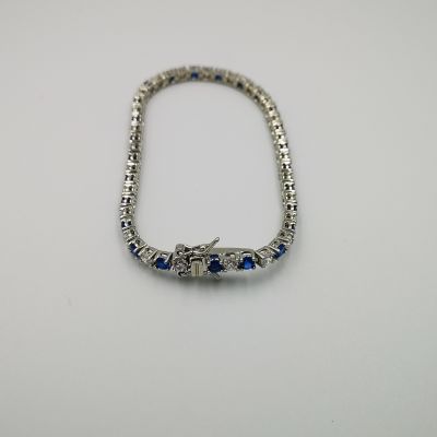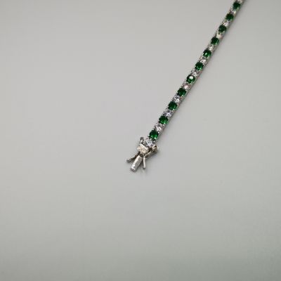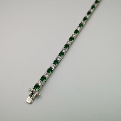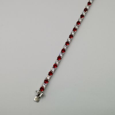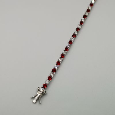 Ezüst női karkötő színes cirkóniák foglalatban. Piros-átlátszó, kék-átlátszó és zöld-átlátszó színekben kapható. Ródium bevonattal van ellátva,hogy jobban ellenálljon a környezeti hatásoknak és sokáig megőrizze az ezüst fényét. Színválasztást a megjegyzés rovatnál kell feltüntetni. Záródása dupla csatos.