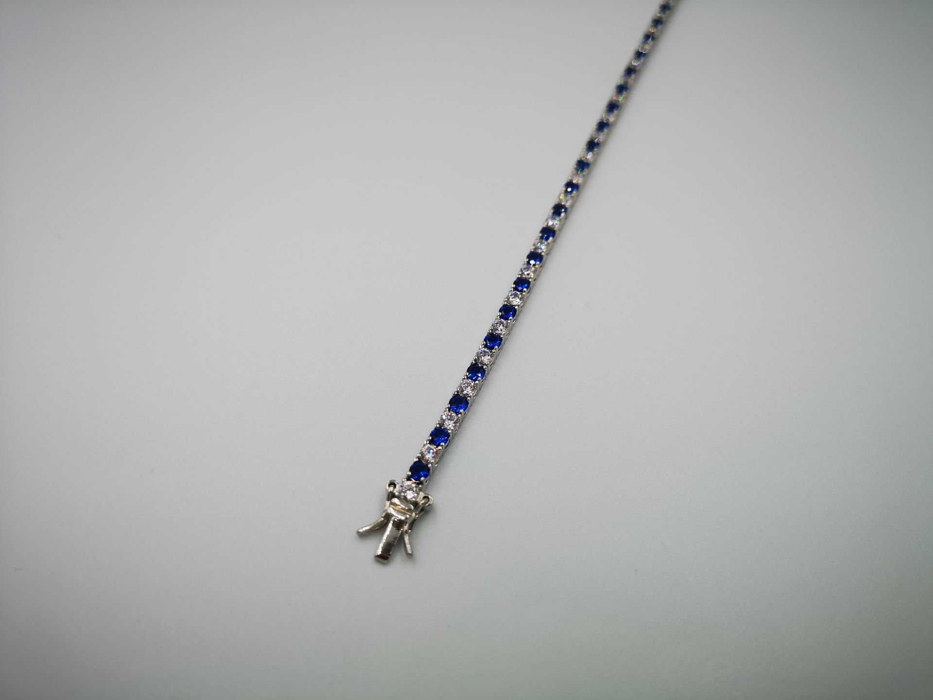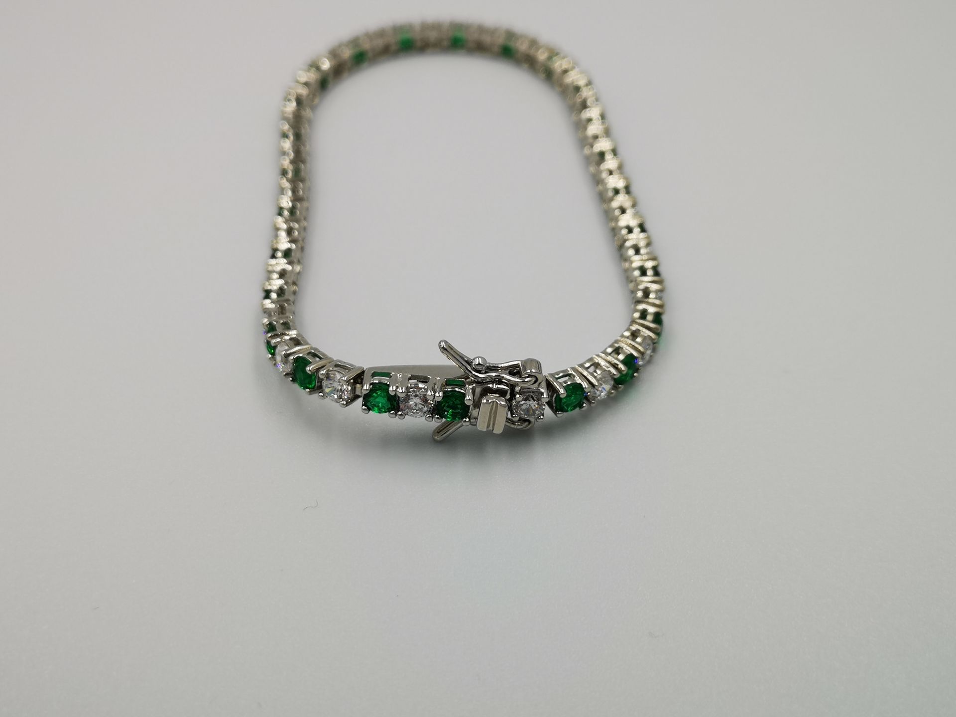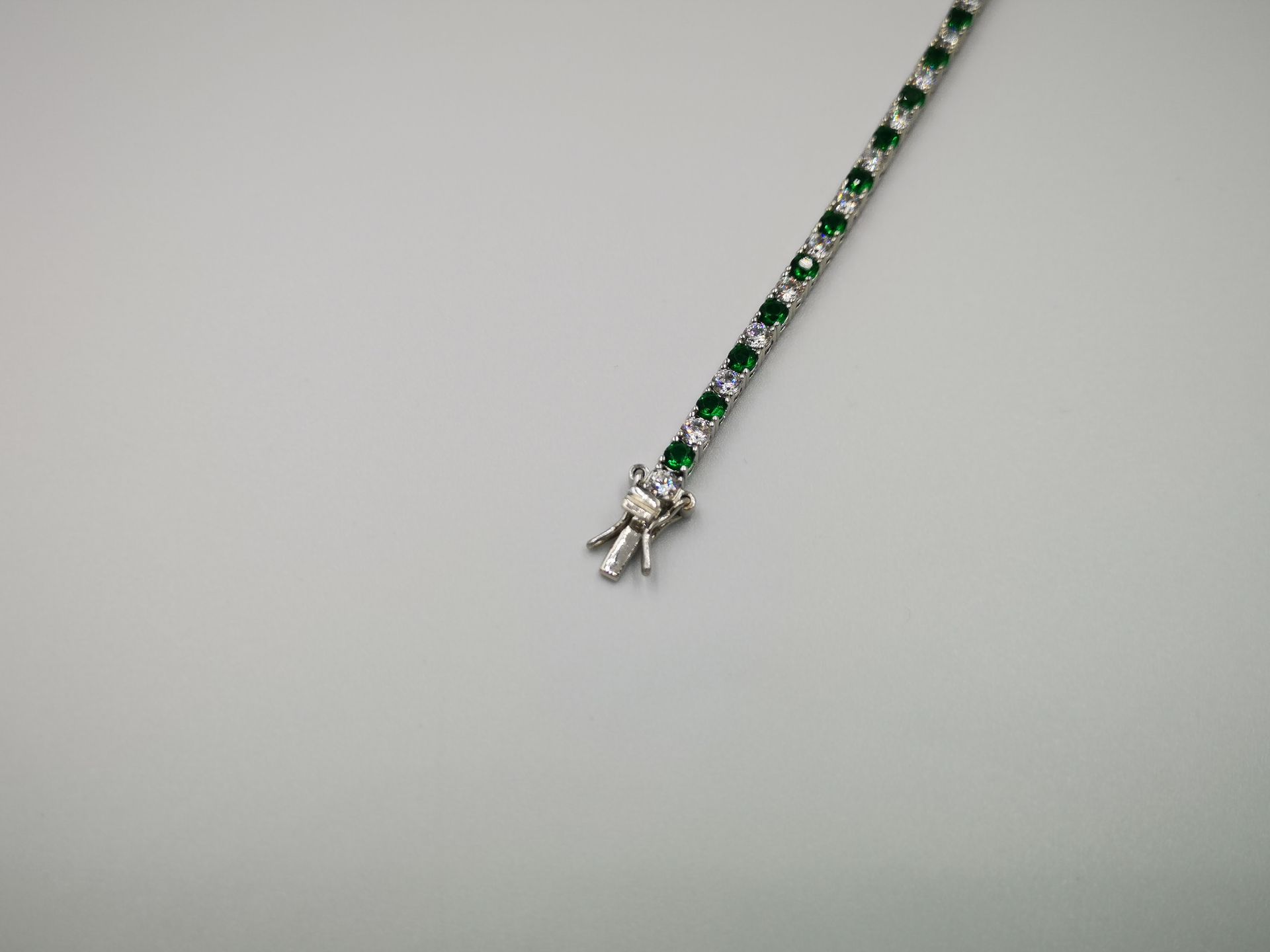 Ezüst női karkötő színes cirkóniák foglalatban. Piros-átlátszó, kék-átlátszó és zöld-átlátszó színekben kapható. Ródium bevonattal van ellátva,hogy jobban ellenálljon a környezeti hatásoknak és sokáig megőrizze az ezüst fényét. Színválasztást a megjegyzés rovatnál kell feltüntetni. Záródása dupla csatos.