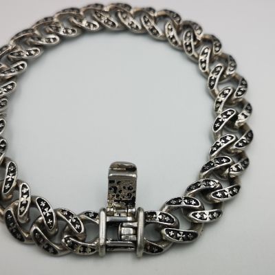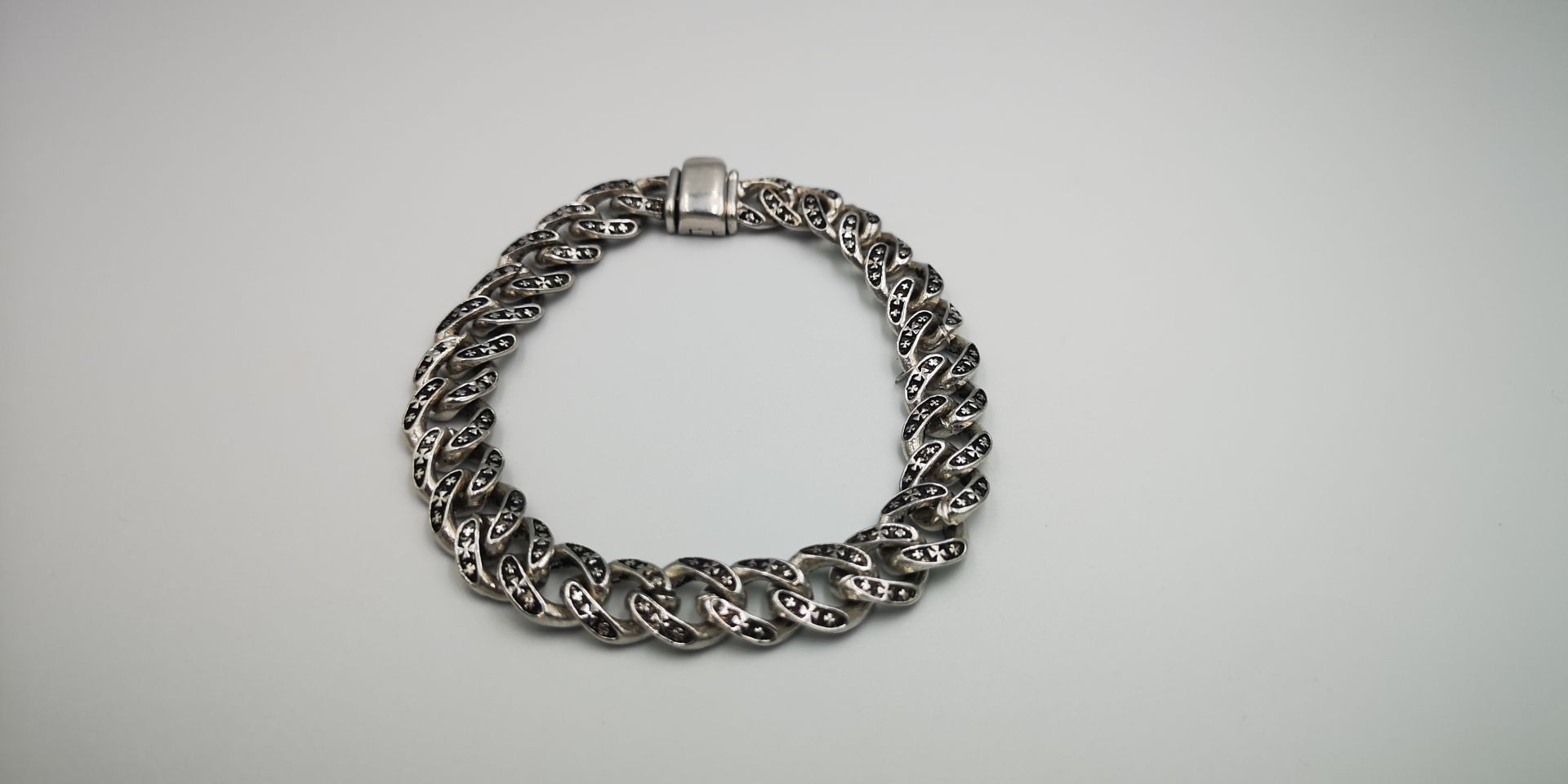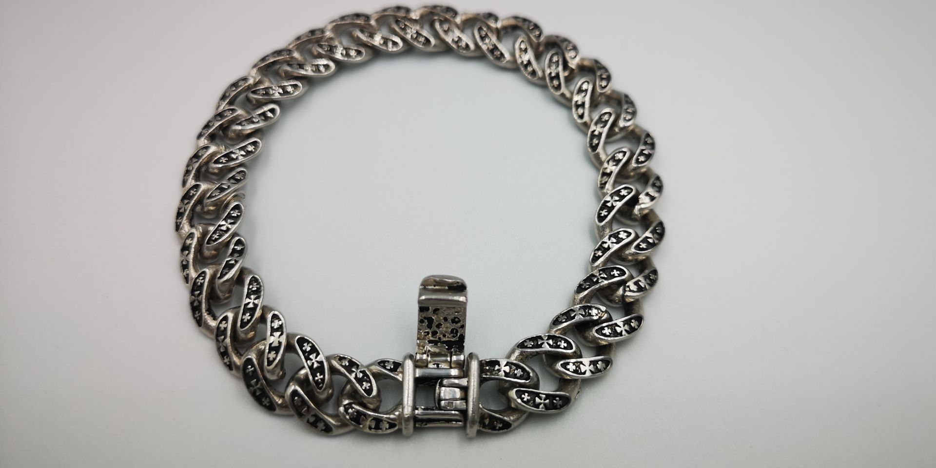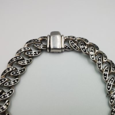 Ezüst férfi karkötő öregbített,pancer stílus. Karkötő hossza:21cm Szélessége:10,6mm Vastagsága:3,8mm