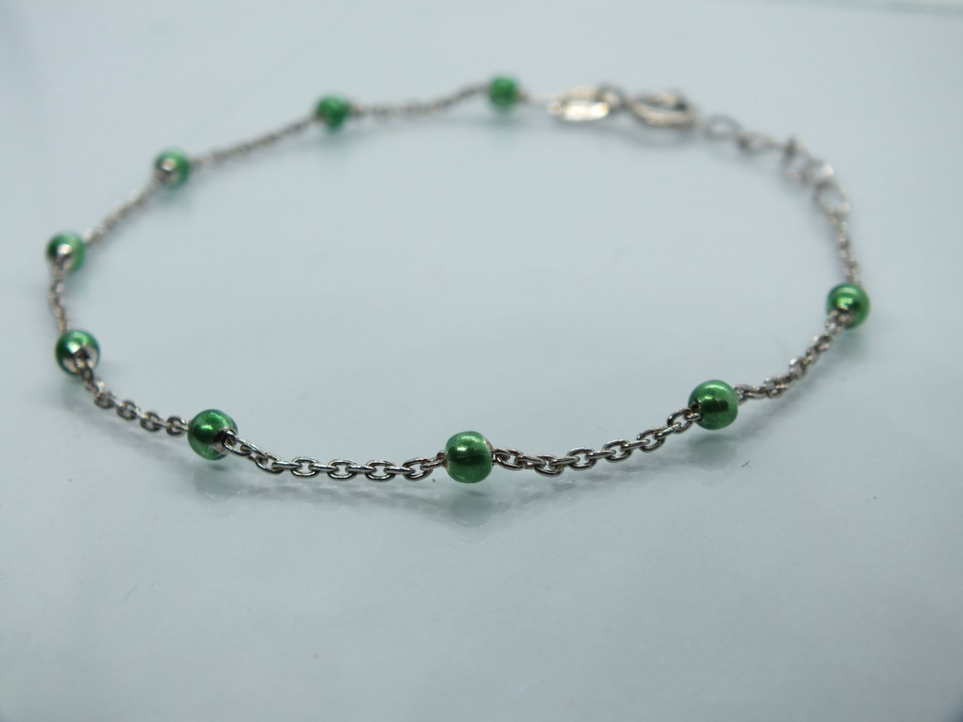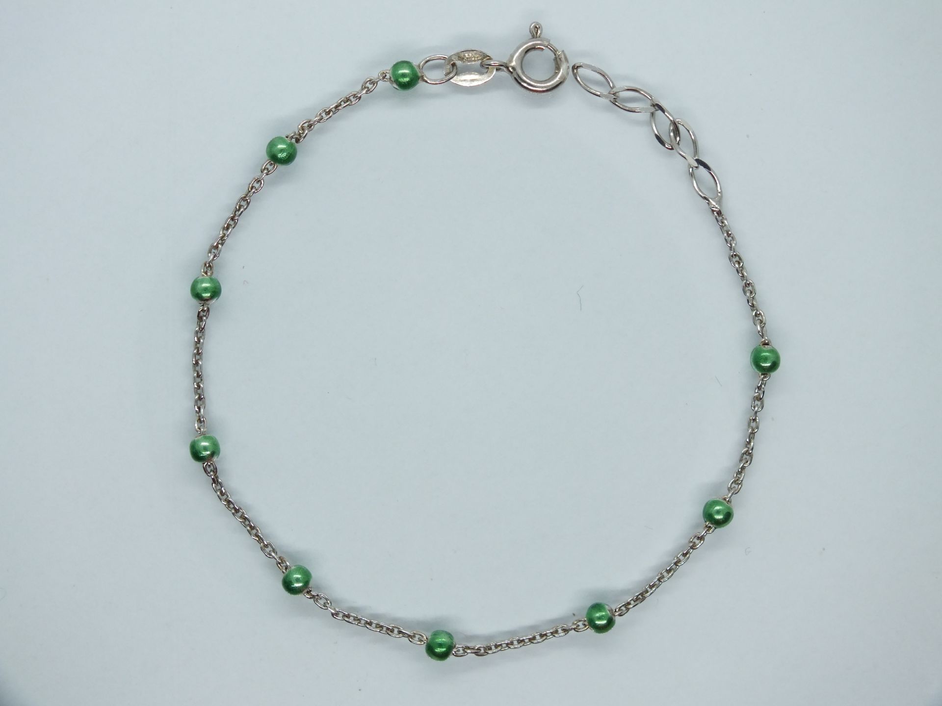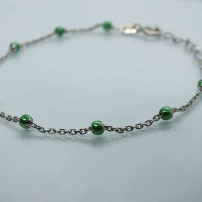 Ezüst női karkötő apró kerek szemek anker stílus,zöld színű gyöngyökkel díszítve.Ródium bevonattal kapható.