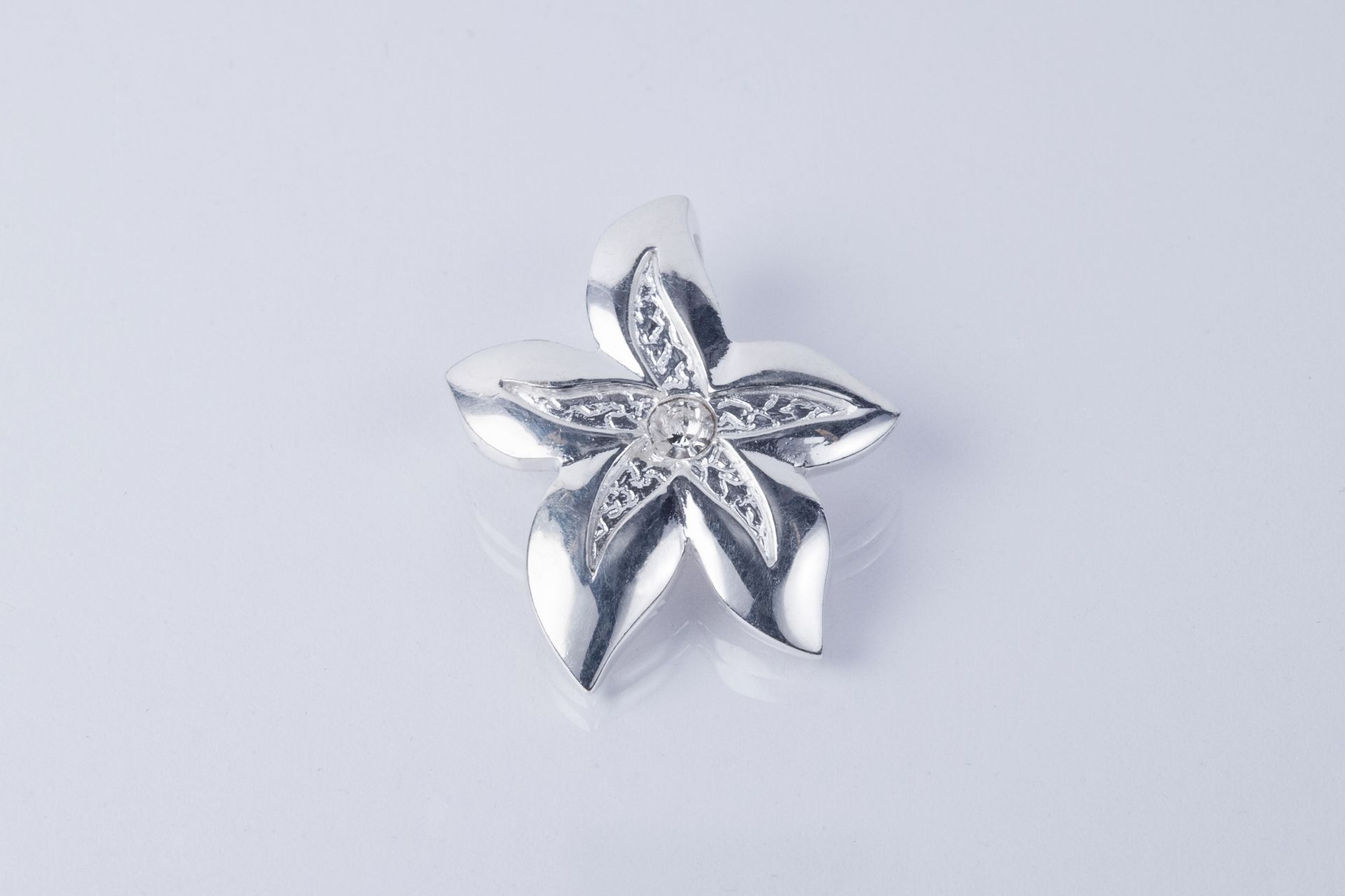 Virág formájú ezüst medál,közepén gyöngy díszítéssel. Medál átmérője:23,6mm Medál vastagsága:2,6mm