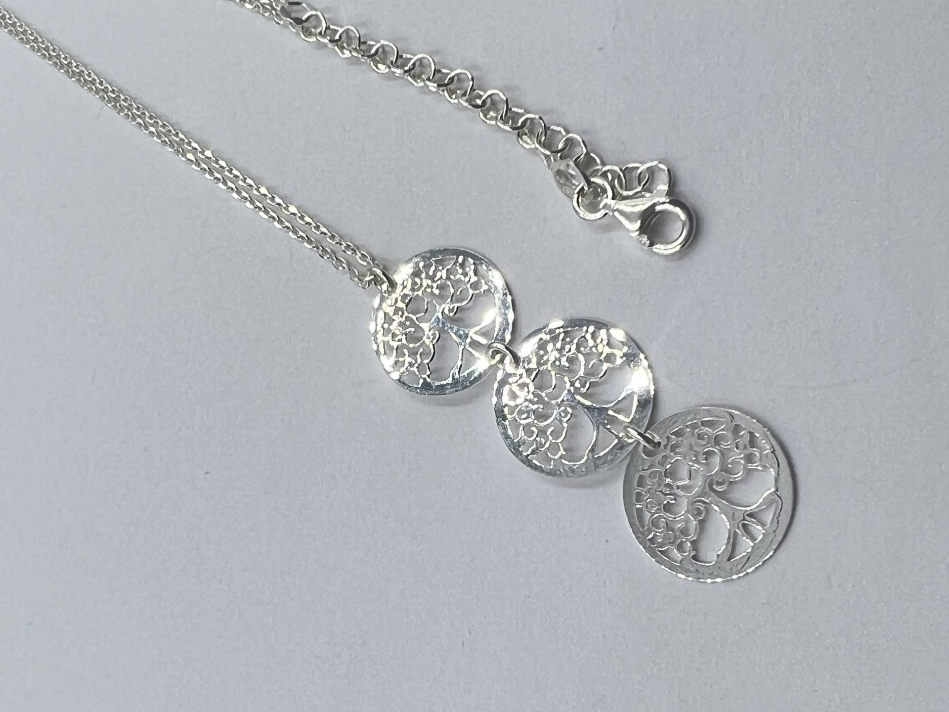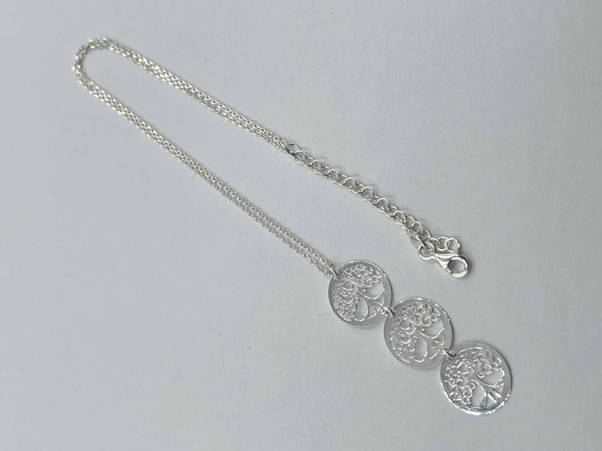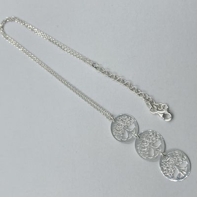 Ezüst női nyaklánc anker stílus, 3 egymás alatt el helyezkedő életfája mozgó medállal.