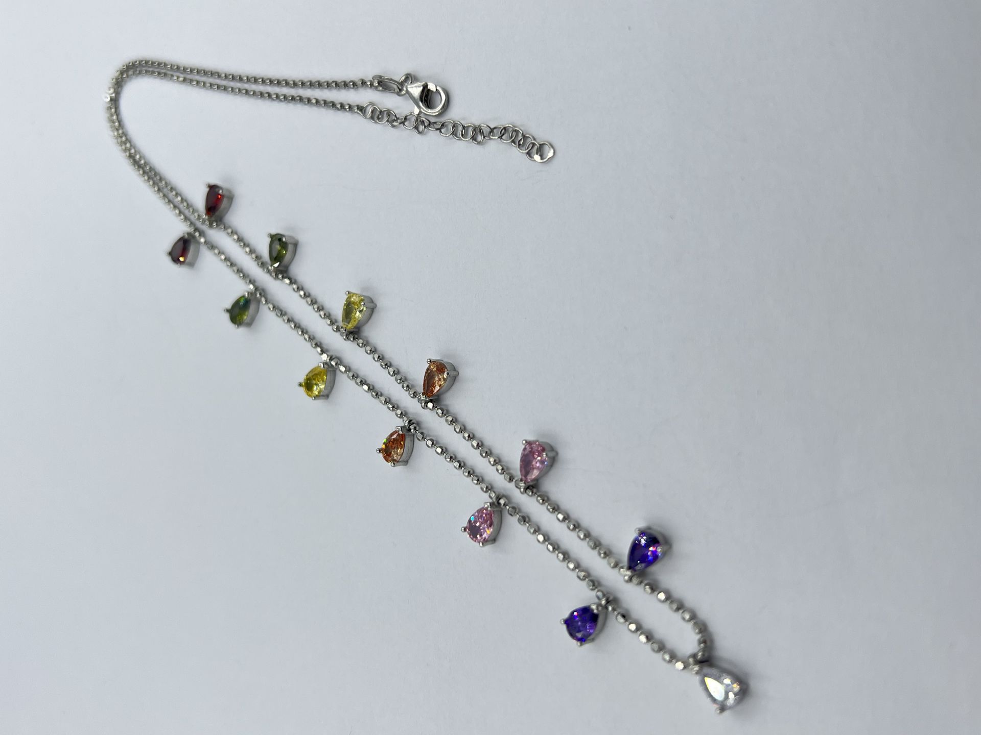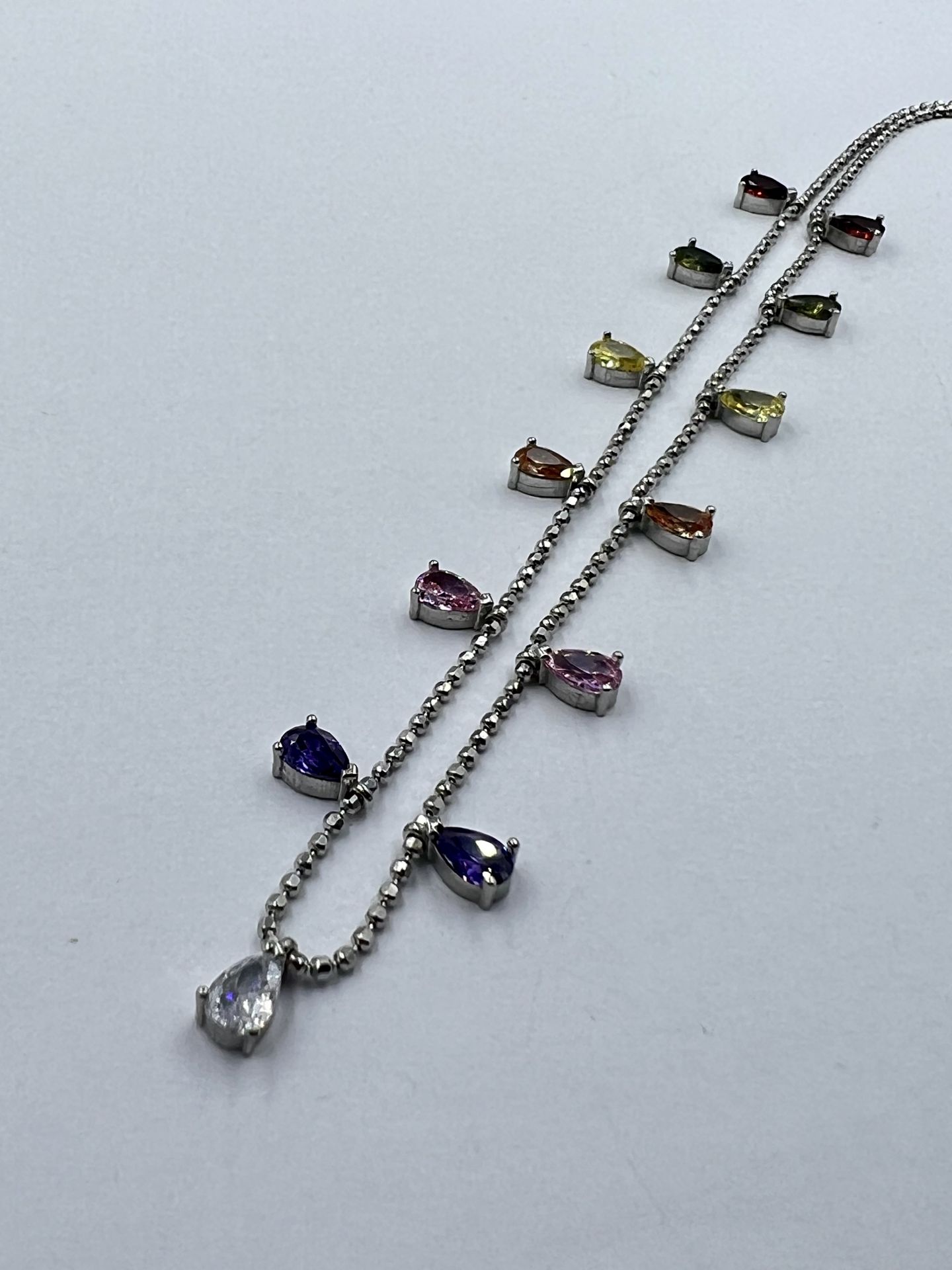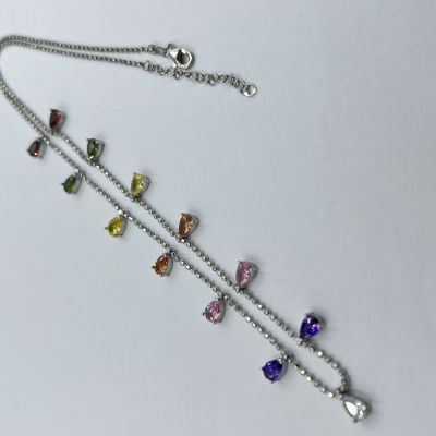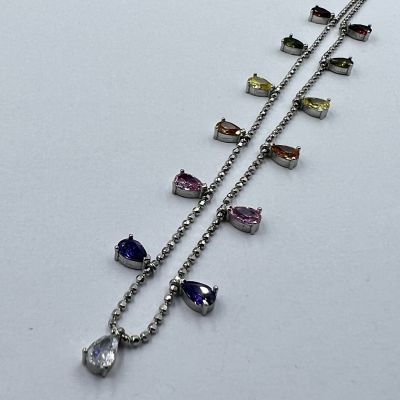 Ezüst női nyaklánc katonai kocka stílus, mely színes csepp alakú cirkónia kövekkel díszítettek. Ródium bevonattal van ellátva,hogy jobban ellen álljon a környezeti hatásoknak és megőrizze az ezüst fényét.