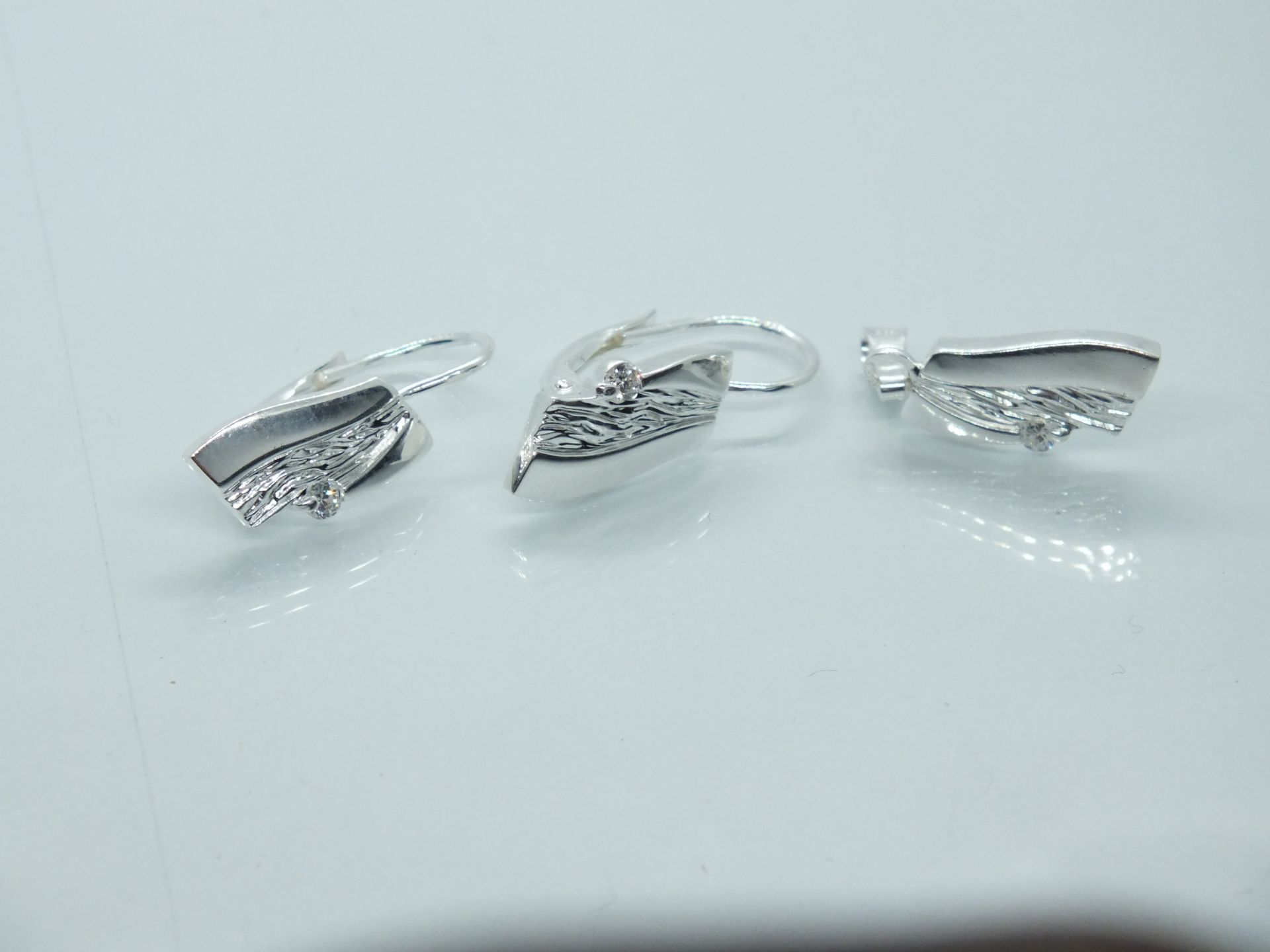 Ezüst női szett fülbevalóval és medállal.Fatörzs alakja vésetekkel,középen egy átlátszó cirkónia kő díszítés.