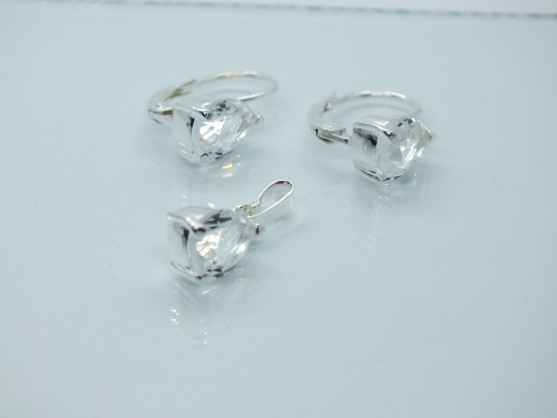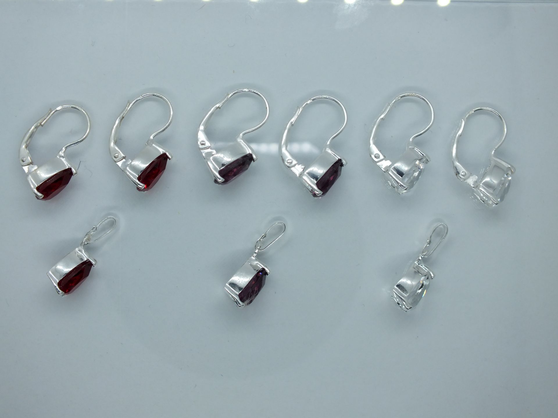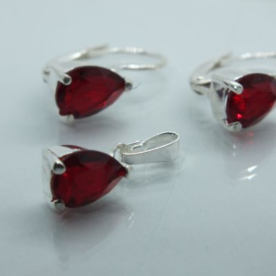 Ezüst női szett fülbevalóval és medállal.Könnycsepp forma átlátszó és piros cirkónia kő foglalatban.Színválasztást a megjegyzés rovatnál kell feltüntetni.