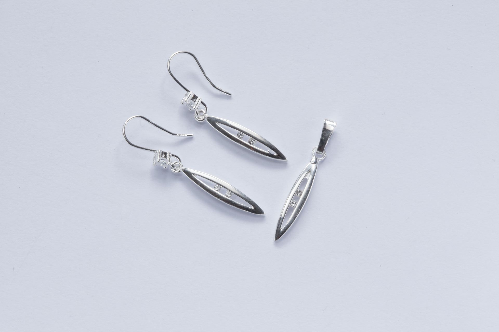 Ezüst női szett fülbevalóval és medállal.Ovális kör átlátszó csiszolt cirkónia kő foglalatban. ...