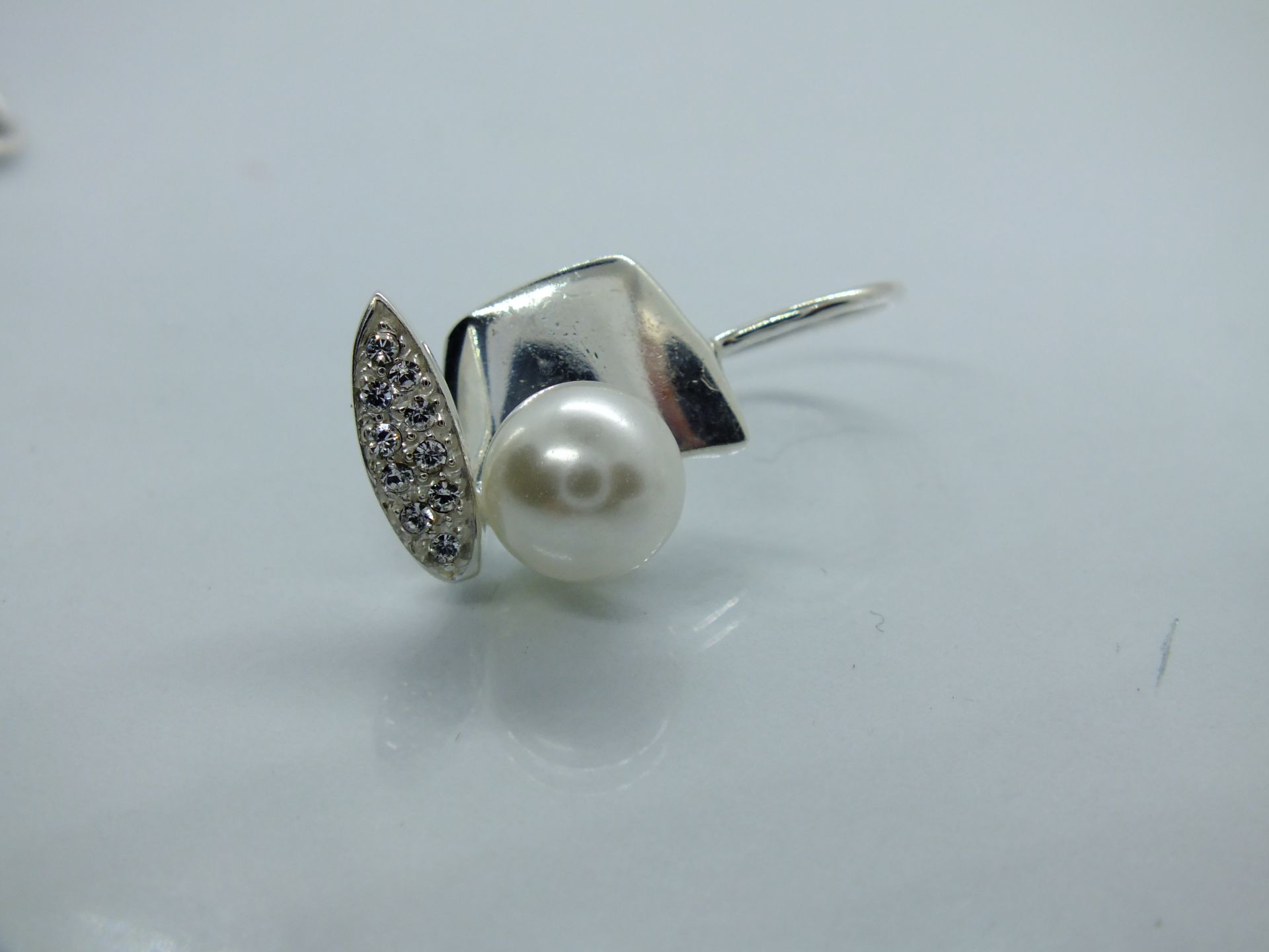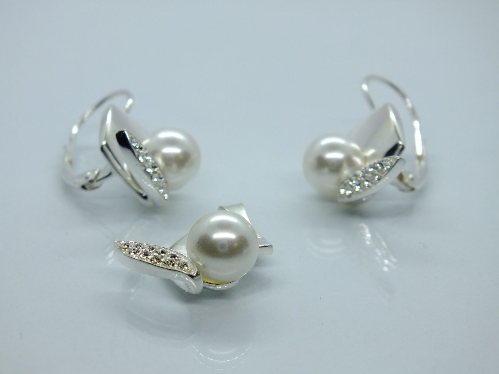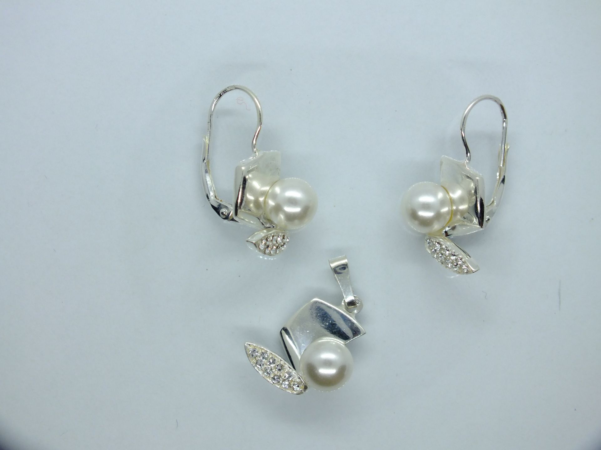 Ezüst női szett fülbevalóval és medállal.Fényes felület rajta fehér gyöngy és levél forma cirkóniákkal.