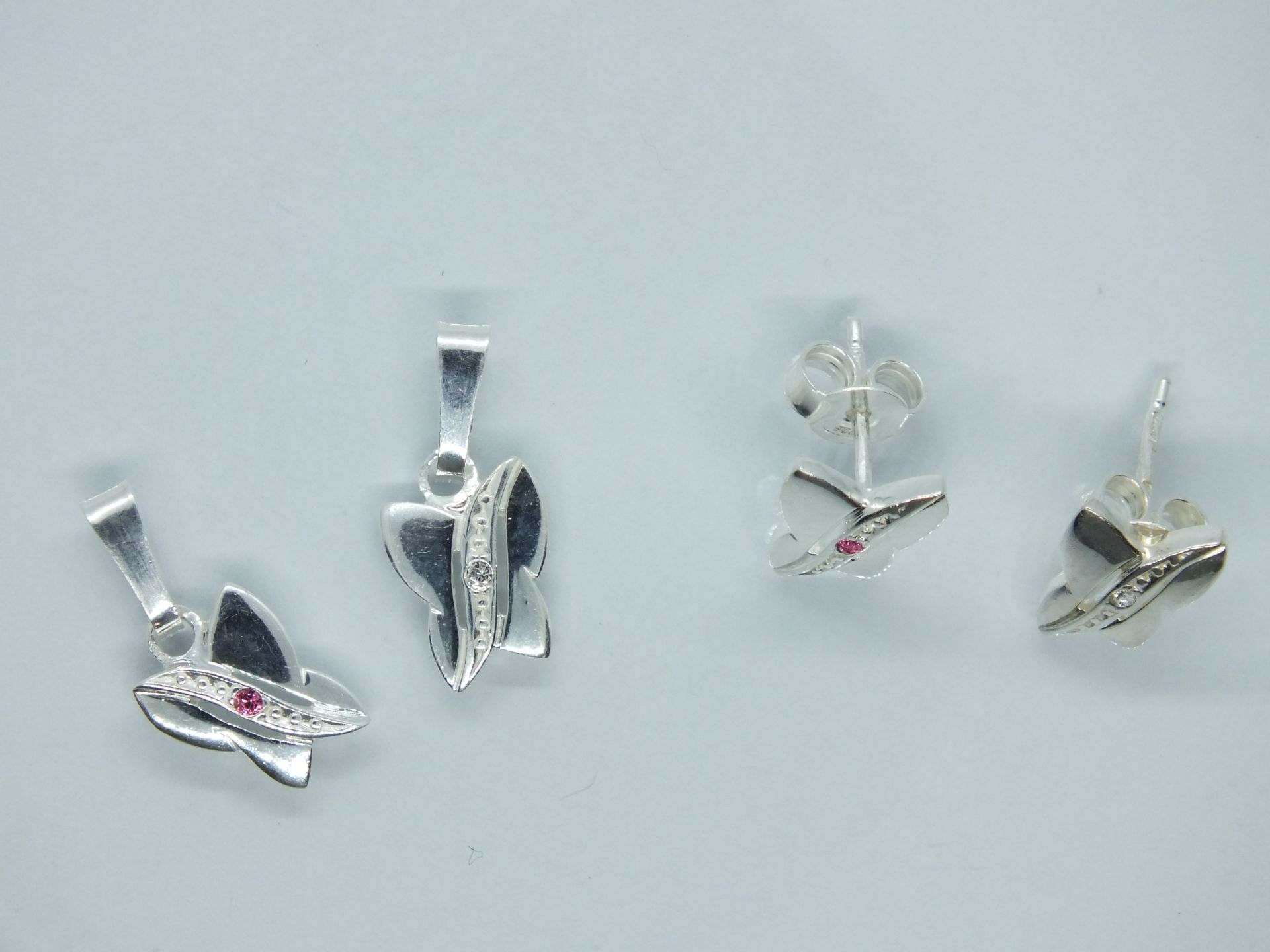 Ezüst női szett medállal és fülbevalóval.Pillangó forma melynek a közepén pici cirkóna kő található melynek színe halványrózsaszín a többi cirkónia átlátszó.