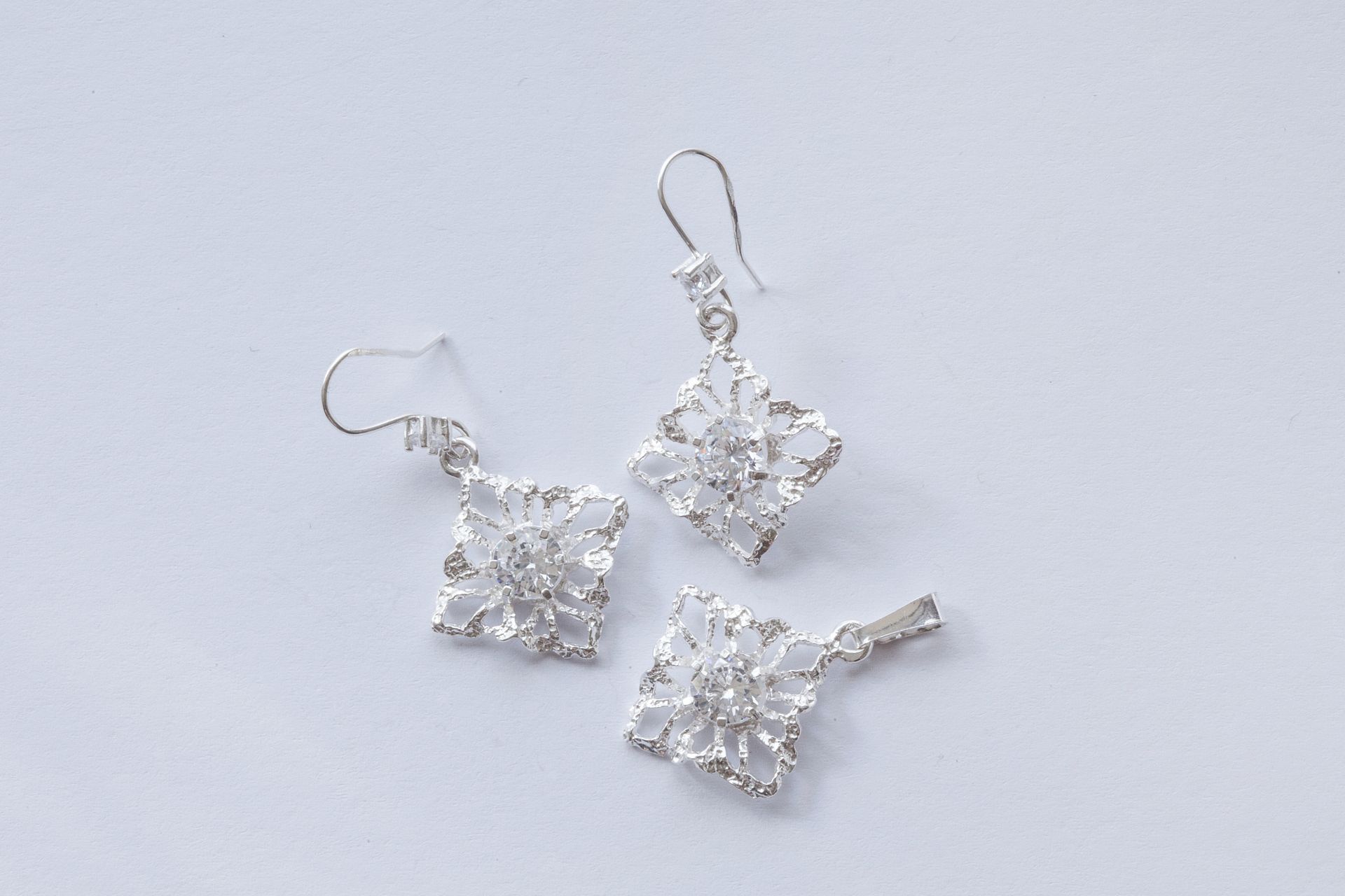Ezüst női szett,medállal és fülbevalóval.Kerek formája üreges,virág alakkal beütve. ...