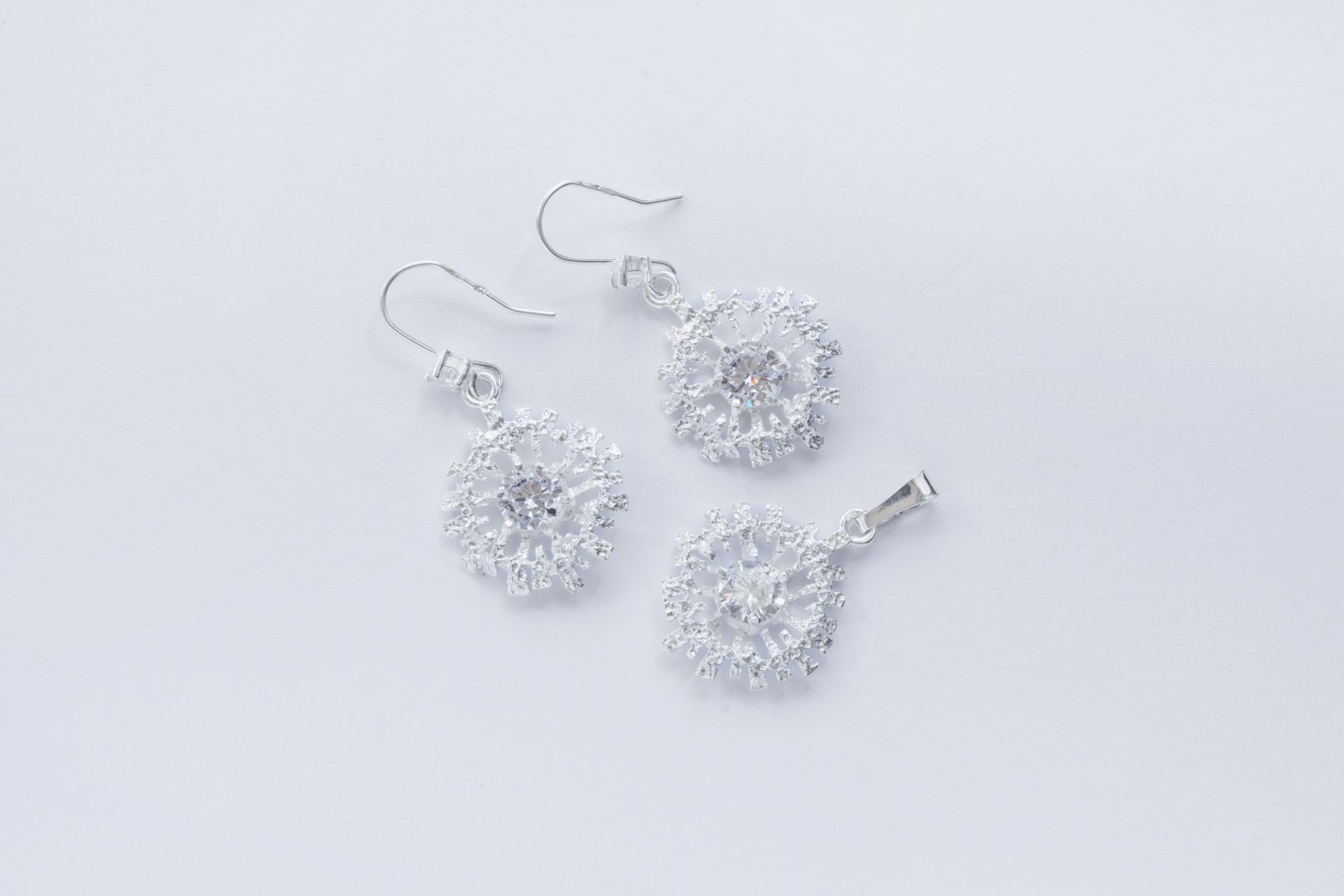 Ezüst női szett medállal és fülbevalóval.Kör alakú nap motívum,közepén átlátszó vagy kék cirkónia kő díszítés.