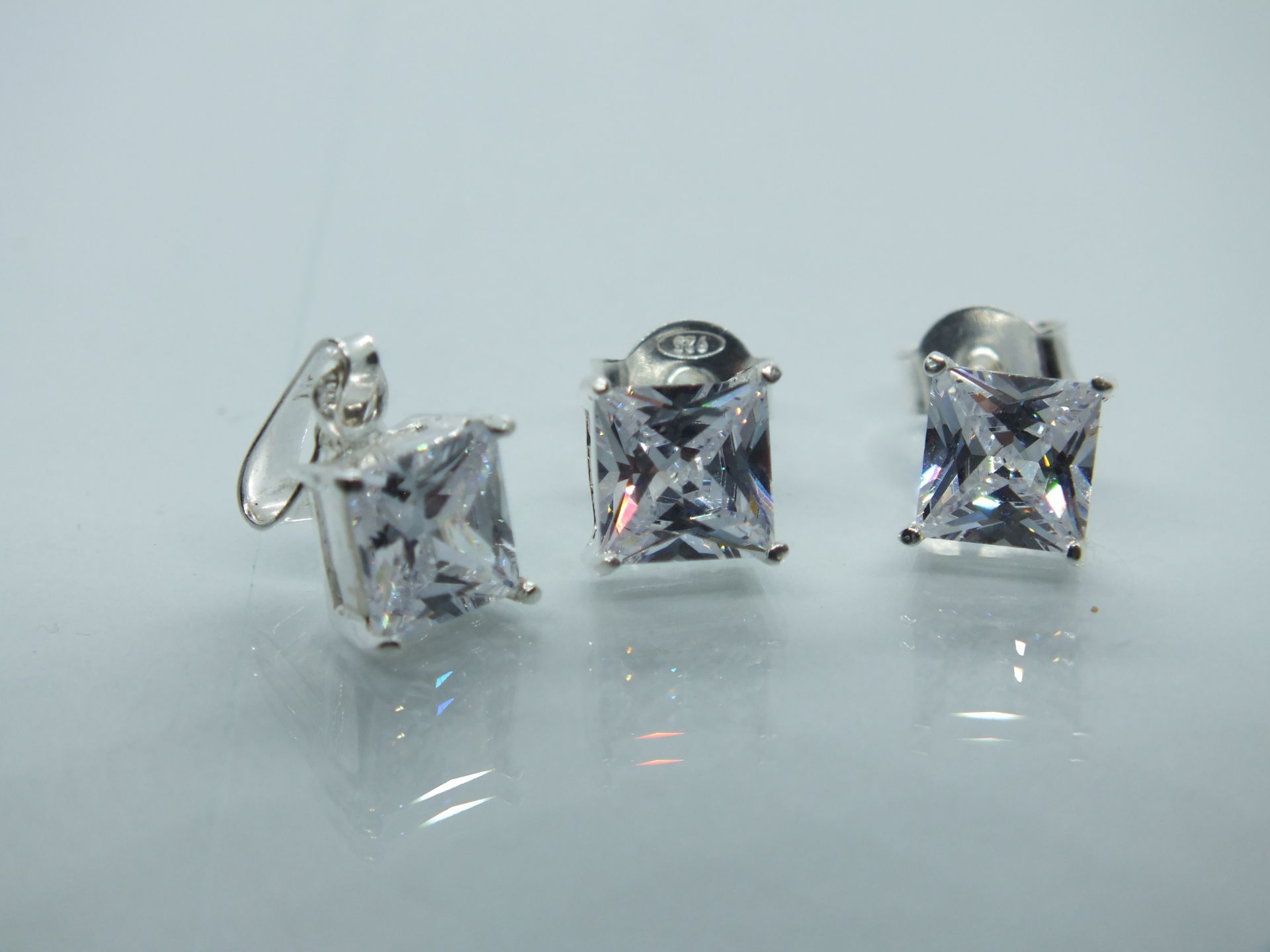 Ezüst női szett fülbevalóval és medállal.Függő trapéz,végén kissé szélesedő formával.Egyik oldala átlátszó...