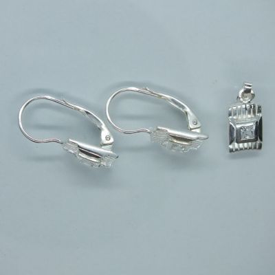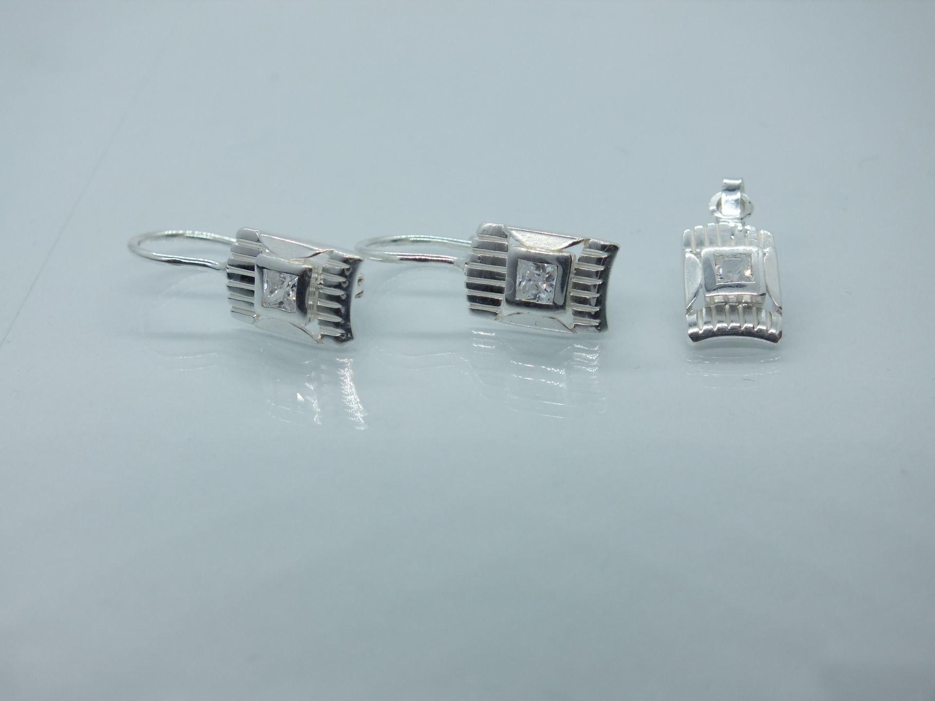 Ezüst női szett fülbevalóval és medállal.Téglalap alakja alsó és felső részen vésetek,középen foglaltban egy átlátszó cirkónia kő található.