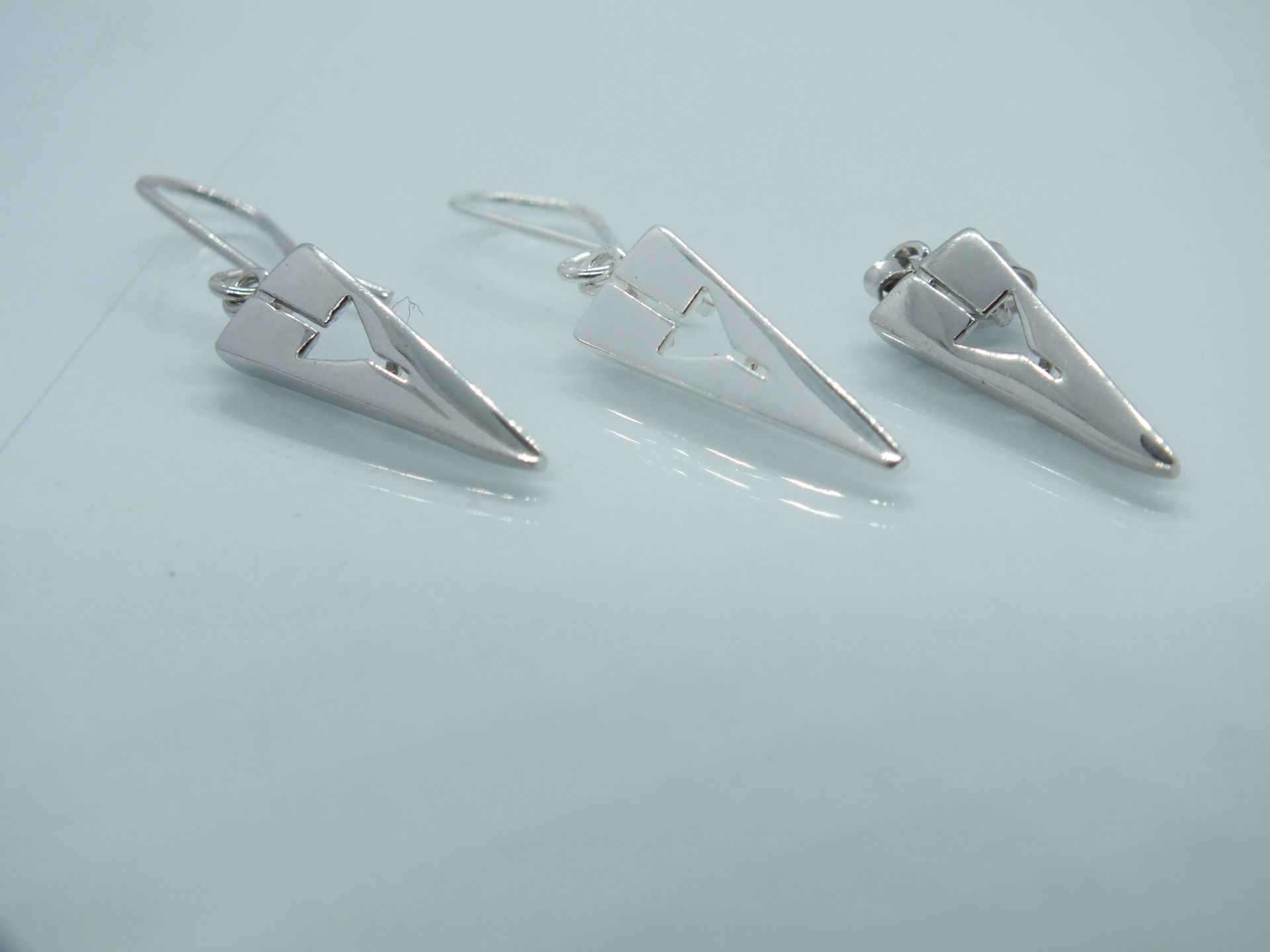 Ezüst női szett fülbevalóval és medállal.Nyújtott háromszög forma,melynek közepén ismétlődő háromszög alak látható.