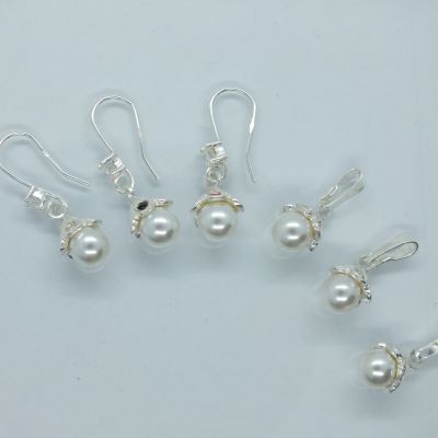 Ezüst női szett fülbevalóval és medállal.Virág alakú forma fehér gyönggyel.A virág szirmok átlátszó,rózsaszín