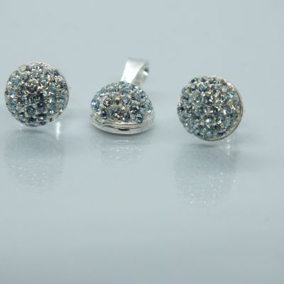 Ezüst női szett fülbevalóval és medállal.Félkör alakja átlátszó és világoskék swarovski kövekkel díszített.Ródium bevonattal kapható.