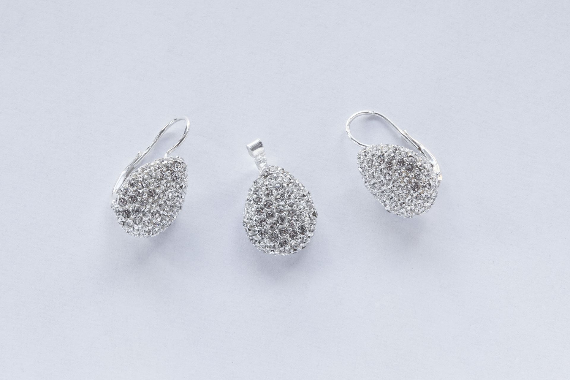 Ezüst női szett,medállal és fülbevalóval.Könnycsepp alakja átlátszó swarovski kövekkel díszített.