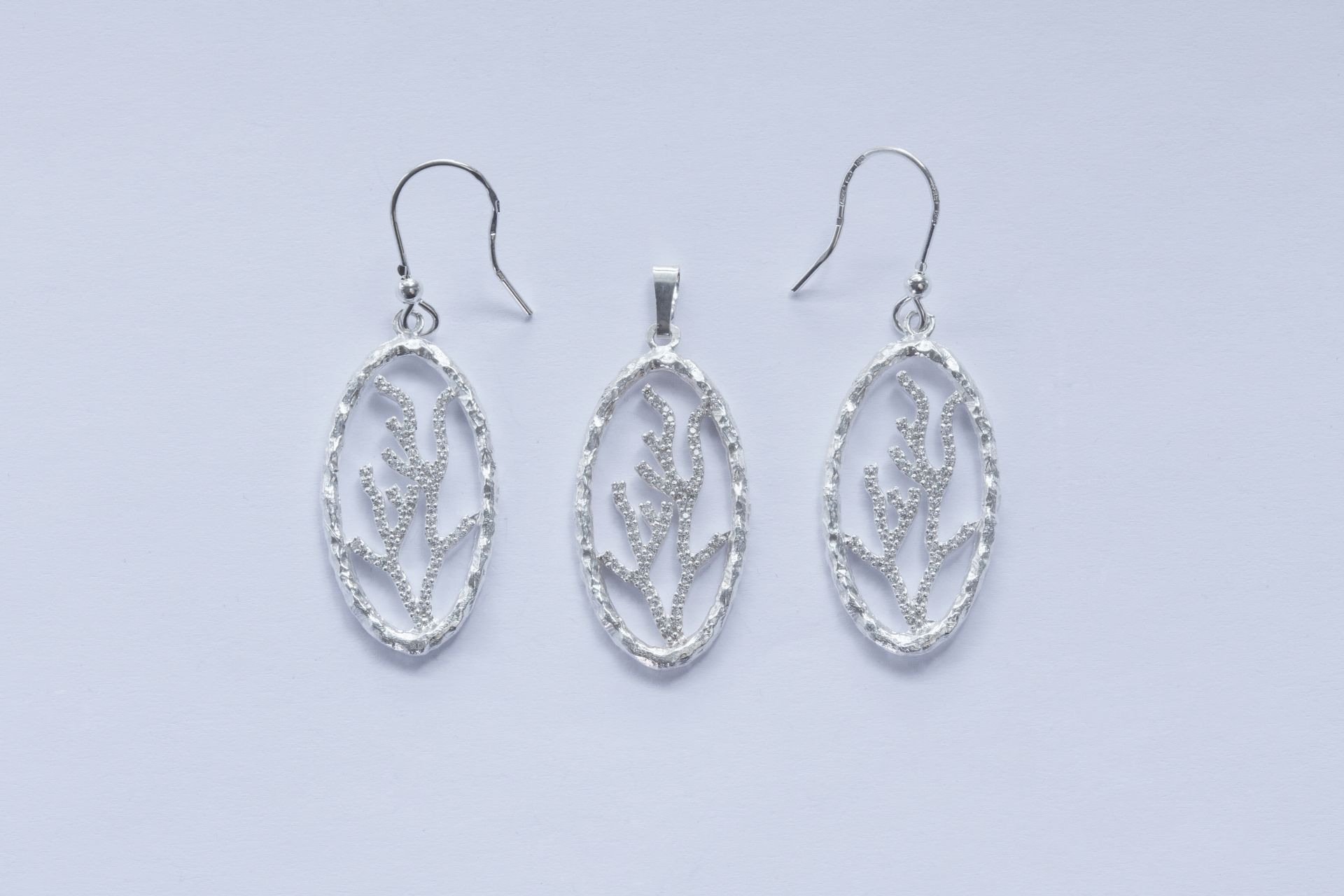 Ezüst női szett,hosszú ovális forma,belseje fa ág díszítés mely apró átlátszó cirkóniák díszítik.